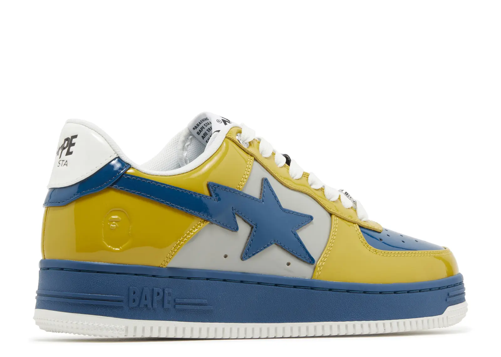 A Bathing Ape Bape Sta #2 patent sneakers in a yellow and blue colorway